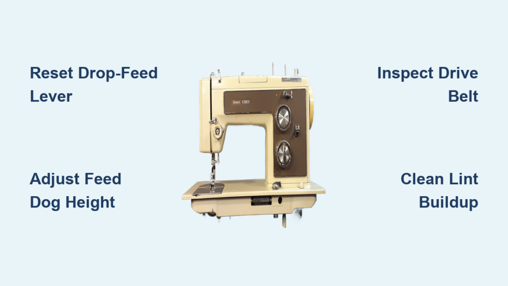 Your Kenmore sewing machine suddenly stops feeding fabric properly—the feed dogs spin uselessly below the needle plate while your fabric
