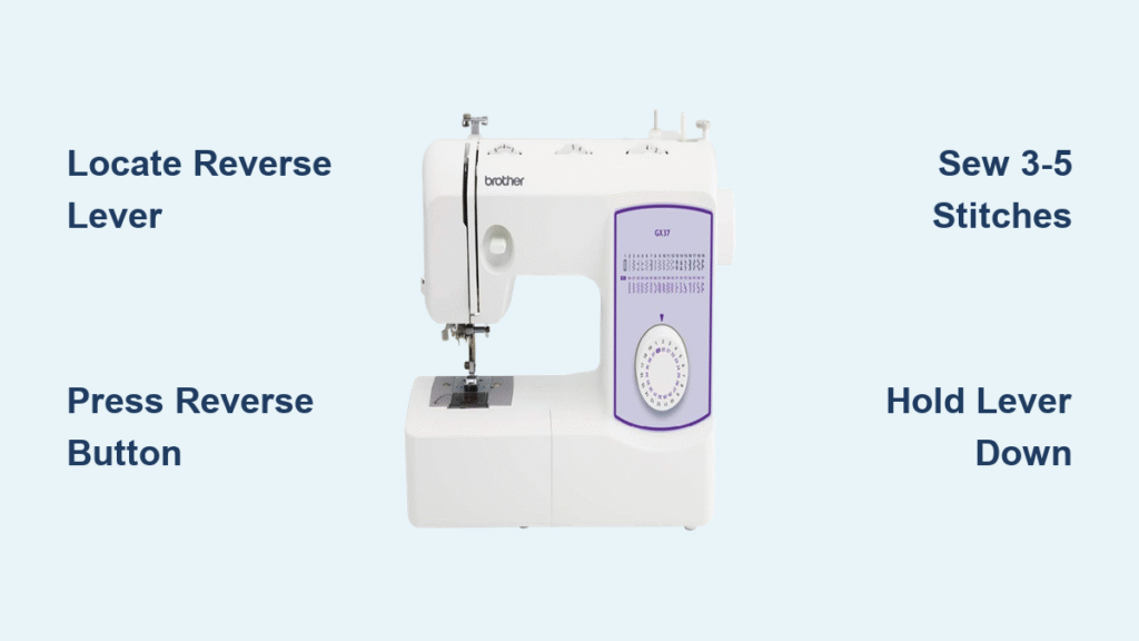 On Brother XR3774 and XR9550 machines, the reverse lever hides directly under the needle head on the front right side. It’s a small metal tab marked with a backward-pointing U-shaped arrow. Unlike push-button models, this lever requires continuous pressure while stitching—hold it down with your left thumb while guiding fabric with your right hand. Warning: Releasing early creates weak anchor points. Test it on scrap fabric first; you’ll hear a distinct change in motor pitch when engaged.