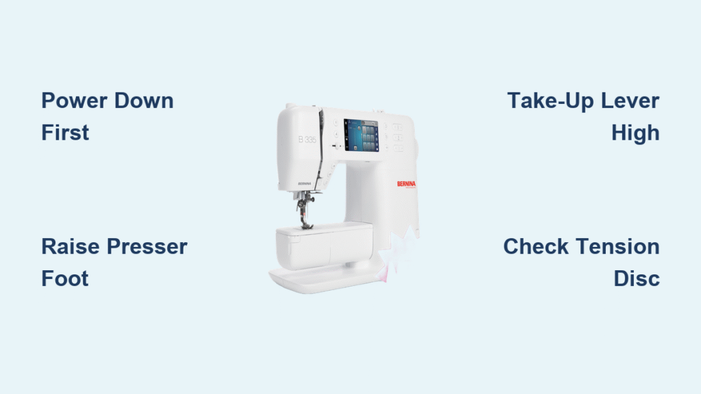 Never thread with power engaged—Bernina’s electronic memory keeps needle position active even when “off.” A momentary foot pedal bump while threading could drive the needle through your finger. Unplug your machine completely, especially computerized models that maintain power to positioning systems. This simple precaution prevents thousands of sewing-related injuries annually.